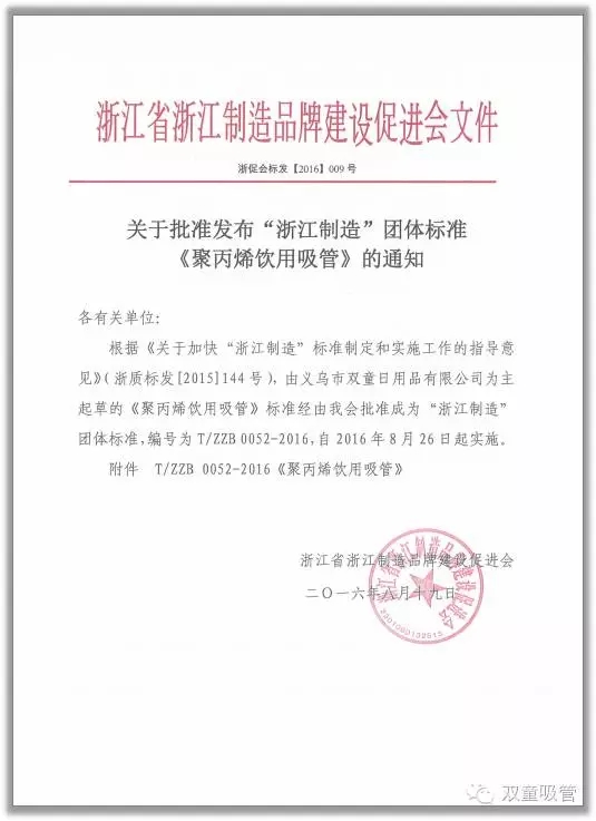 據(jù)了解,截至目前,已提前完成全年100個“浙江制造”標(biāo)準(zhǔn)的制定任務(wù),預(yù)計到年底前將制定“浙江制造”標(biāo)準(zhǔn)120個。而早在今年的8月26日,“雙童”就收到了浙江省浙江制造品牌建設(shè)促進(jìn)會發(fā)出的通知,正式通知由“雙童”為主起草的“浙江制造”團(tuán)體標(biāo)準(zhǔn)《聚丙烯飲用吸管》正式發(fā)布實(shí)施!