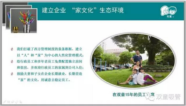 “雙童一直以利他之心影響員工,除了不斷提升硬件,同時(shí)倡導(dǎo)家文化,解決核心員工家庭生活問(wèn)題;建立職業(yè)提升規(guī)劃,系統(tǒng)性開(kāi)展全員教育,通過(guò)學(xué)習(xí)、培訓(xùn)、文化影響、社團(tuán)活動(dòng)等方式全面提升員工整體素養(yǎng),逐漸改變員工的意識(shí)形態(tài)和生活習(xí)慣,從而間接地提升產(chǎn)品的品質(zhì)而改變企業(yè),培養(yǎng)員工成為一個(gè)個(gè)匠人。這也是利他的背后一定是利已的商業(yè)本質(zhì)!