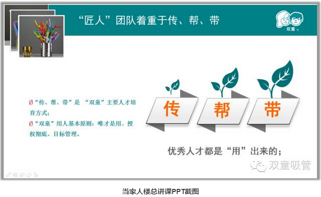俗話說(shuō):團(tuán)隊(duì)好企業(yè)才能好雙童培養(yǎng)經(jīng)理人團(tuán)隊(duì)成為匠人的方式就是傳、幫、帶!當(dāng)初,當(dāng)家人樓總把總經(jīng)理李二橋和吸管妞帶著身邊培養(yǎng),左邊坐著吸管妞右邊坐著總經(jīng)理李二橋,通過(guò)一起工作影響身邊的人!