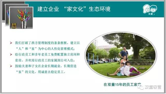 第二章,當(dāng)家人樓總從自身擴(kuò)大到“雙童”團(tuán)隊(duì),談到“雙童”不斷地進(jìn)行硬件改革,給員工提供最好的工作和生活環(huán)境,致力于建立“家文化”,鼓勵(lì)夫妻和子女在企業(yè)就業(yè),解決核心員工家庭生活問(wèn)題,長(zhǎng)期營(yíng)造“家”的文化,用誠(chéng)意去穩(wěn)定員工!