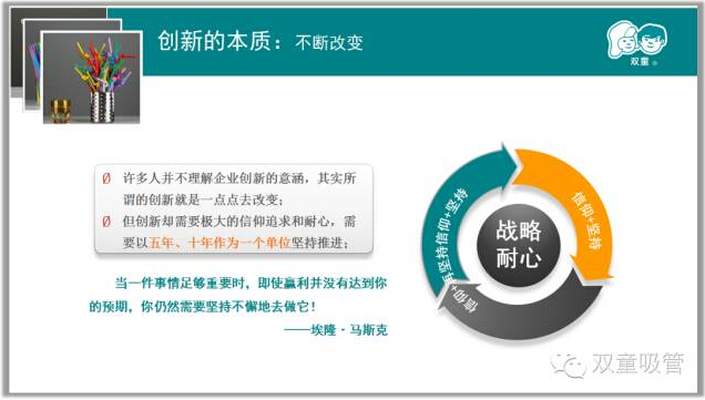 其實(shí)真正把自己的產(chǎn)品做好了,企業(yè)在一定時(shí)候擴(kuò)大規(guī)模才是自然而至的,因此不要一畏地想著大,適當(dāng)做減法,寧可盈利不作大,不可做大不盈利!“雙童”的發(fā)展始終伴隨著不斷的放棄,在自己的領(lǐng)域里細(xì)分細(xì)分再細(xì)分,把一根吸管做到極致!
