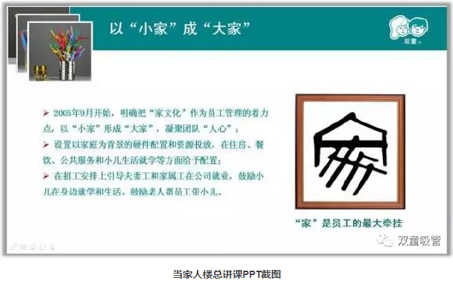 從管理的本質上來說,管理理念也應該與當?shù)氐膫鹘y(tǒng)文化相結合,由于“家庭”是中國人傳統(tǒng)觀念的最大牽掛,所以在管理上不能一味學習西方管理科學。這幾年由于外出務工的農民工越來越多,兩地分居、留守兒童、性饑荒等問題逐漸成為中國社會和企業(yè)管理的重大問題。但因為形成了“家文化”氛圍,這些問題在“雙童”都得到了根本性解決,也讓企業(yè)避免了許多復雜性問題,更加和諧!