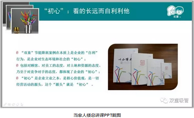 最后,當(dāng)家人樓總分享到企業(yè)應(yīng)該不斷創(chuàng)新,2003年“雙童”基于互聯(lián)網(wǎng)思維的渠道進(jìn)行變革,倡導(dǎo)小客戶原則,從大規(guī)模薄利多銷轉(zhuǎn)向:品牌化、個(gè)性化、信息化,在自身的領(lǐng)域細(xì)分、細(xì)分、再細(xì)分,把一根吸管做到極致!