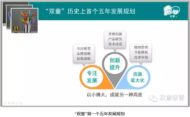 在同質(zhì)化競(jìng)爭(zhēng)日益激烈的大背景下,促使著“雙童”放棄做低端的吸管,做中高端產(chǎn)品。早在2005年,“雙童”頒布的第一個(gè)五年發(fā)展規(guī)劃中就提出了“創(chuàng)新提升”的關(guān)鍵詞。接下來兩個(gè)五年發(fā)展規(guī)劃中也提出了“持續(xù)創(chuàng)新”、“開展有效創(chuàng)新”的關(guān)鍵詞,以此作為今后的方向目標(biāo)和理念。