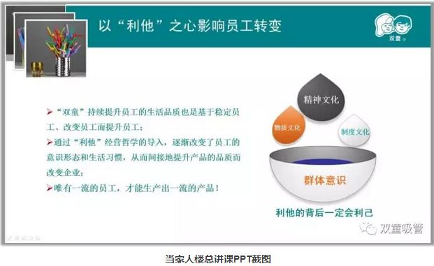 同時“雙童”持續(xù)提升員工生活品質(zhì)其目的不僅僅在于“善心”和“愛心”,也是基于穩(wěn)定員工、改變員工而提升員工!影響產(chǎn)品質(zhì)量的最大要素是人的內(nèi)心,通過“利他”的方式,逐漸改變員工的意識形態(tài)和生活習(xí)慣,從而間接地提升產(chǎn)品的品質(zhì)而改變企業(yè)。員工的習(xí)慣好了,思想轉(zhuǎn)變了,才能用“心”生產(chǎn)出一流的產(chǎn)品!