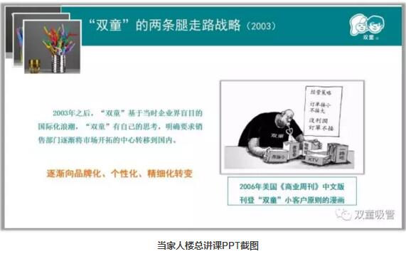 “雙童”是一家互聯(lián)網(wǎng)創(chuàng)新企業(yè),也是中國第一批使用互聯(lián)網(wǎng)尋找商機,聯(lián)絡客戶的企業(yè)!2003年,“雙童”基于互聯(lián)網(wǎng)思維實施了小客戶原則,逐漸放棄“大客戶”,打破傳統(tǒng)銷售的渠道邊界,實施互聯(lián)網(wǎng)逆向構建:品牌、傳播,讓渠道扁平化,產(chǎn)品個性化!