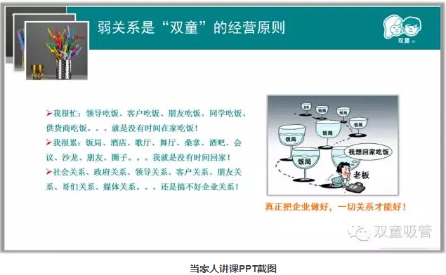 企業(yè)主不要依賴個(gè)人的交際關(guān)系,整天忙著交際,忙著應(yīng)酬,而應(yīng)形成以團(tuán)隊(duì)為主體,與企業(yè)、政府、媒體等形成的良性關(guān)系,從而弱化個(gè)人關(guān)系,強(qiáng)化組織關(guān)系!只有處理好企業(yè)內(nèi)部的人際關(guān)系,建立好企業(yè)與外部的社會(huì)關(guān)系,企業(yè)主才有了自由,企業(yè)才會(huì)真正自由!
