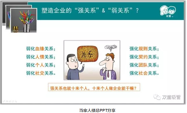 當(dāng)家人樓總十分注重關(guān)系哲學(xué),畢竟一個(gè)人的能力是有限的,他能發(fā)展的強(qiáng)關(guān)系范圍也就只有十來個(gè)人,在企業(yè)經(jīng)營(yíng)中,十多個(gè)人的作用并不大!在企業(yè)內(nèi)部要弱化血緣關(guān)系,強(qiáng)化規(guī)則關(guān)系;弱化人情關(guān)系,強(qiáng)化契約關(guān)系;弱化個(gè)人關(guān)系,強(qiáng)化團(tuán)隊(duì)關(guān)系;弱化社交關(guān)系,強(qiáng)化社會(huì)關(guān)系。