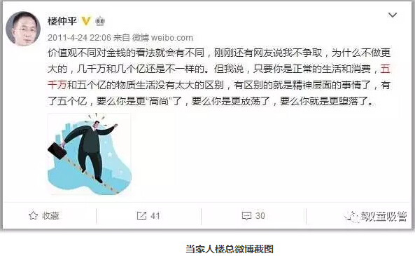 沒錢談不上自由,但有錢也未必自由。原始積累很重要!當(dāng)家人樓總幾年前發(fā)的一條微博道出了他的看法:價(jià)值觀不同對(duì)金錢的看法就會(huì)有不同,其實(shí)只要你是正常的生活和消費(fèi),50000000和5個(gè)億的物質(zhì)生活不會(huì)有太大的區(qū)別,有區(qū)別就是精神層面的事情了,有了5個(gè)億,要么你就更“高尚”了,要么你是更放蕩了,要么你就是更墮落了。