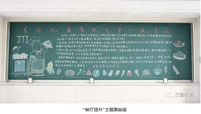 “雙童”員工餐廳配備了五星級(jí)的設(shè)施,有了硬件的保障才能確保餐飲的持續(xù)提升!為了讓員工們對(duì)此次餐飲提升有更全面的了解,我們文宣科也特地出了一期以餐飲提升為主題的黑板報(bào)呢!