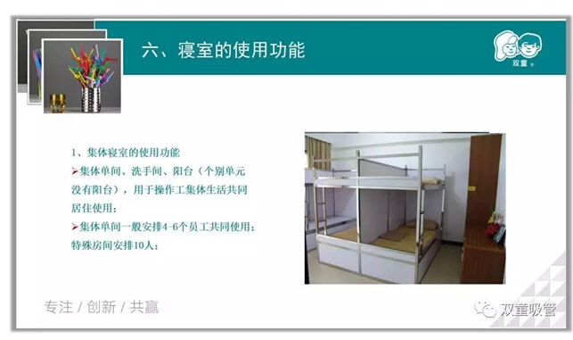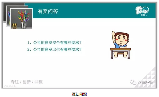 張講師一開場(chǎng)就介紹了各類寢室的配置及安排補(bǔ)貼原則。瞧瞧!員工們聽得多認(rèn)真呀!一到了問答環(huán)節(jié),個(gè)個(gè)都很積極呢,公司的寢室分為哪幾種?具體又是怎么安排分配的?員工們都對(duì)答如流,直呼咱們“雙童”的居住環(huán)境真的很棒!是呀,“雙童”的寢室建立之初就按照三星級(jí)酒店的標(biāo)準(zhǔn)裝修,讓員工們能夠住的開心住的舒心!