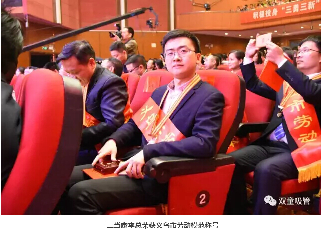 在義烏市長林毅發(fā)表講話之后,副市長施文臻宣讀了義烏市勞動模范、模范集體名單,各勞動模范及模范單位代表上臺接受表彰!這其中也包括了我們的二當家李二橋呢!