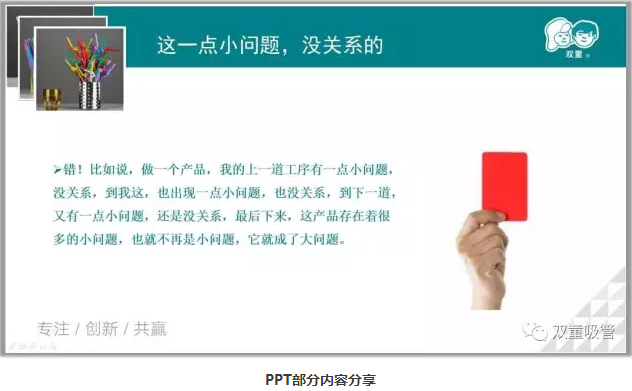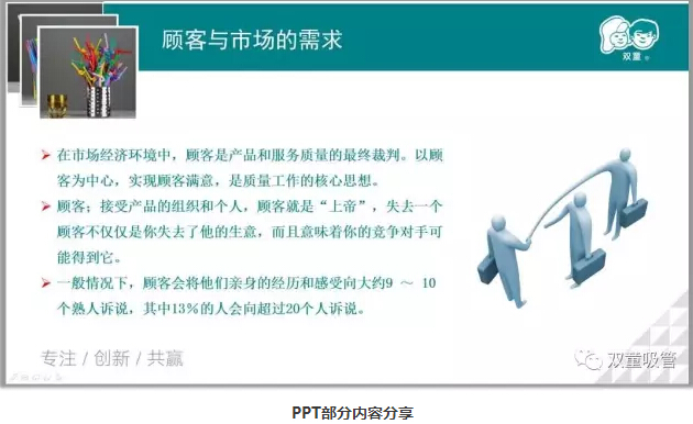 一開場(chǎng),陳講師先介紹了質(zhì)量的定義以及質(zhì)量管理的發(fā)展史,問及“雙童”的質(zhì)量方針時(shí),童鞋們都回答的異口同聲:“支支見品、杯杯見質(zhì);打造“雙童”品牌、提升顧客滿意。”
