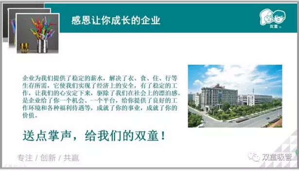 接下來,吸管妞進行了“實踐感恩之心”的主題分享,企業(yè)為我們提供了穩(wěn)定的薪水,解決了衣、食、住、行等生存所需,它使我們實現(xiàn)了經(jīng)濟上的安全,有了穩(wěn)定的工作,給我們提供了平臺和機會……說到這里,童鞋們的掌聲紛紛響起,感謝“雙童”,讓我們成長!