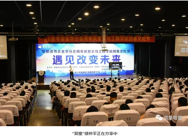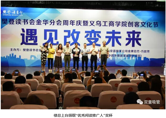 慶典上,樊登讀書會金華分會會長王旭飛進行了致辭,義烏工商學(xué)院賈少華院長也作了“不讀書無成長”的主題分享,指導(dǎo)大家如何培養(yǎng)有學(xué)習(xí)力的孩子。同時,在頒獎環(huán)節(jié)中,“雙童”樓仲平和“雙童吸管”也分別獲得了“優(yōu)秀閱讀推廣人”和“優(yōu)秀企業(yè)讀書會”的榮譽稱號!