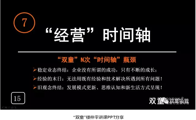 “經(jīng)營”時間軸:樓仲平也用“雙童”的發(fā)展史告訴大家經(jīng)營也是有時間軸的,會遇到瓶頸和“天花板”。企業(yè)沒有所謂的成功,只有不斷的成長,我們無法用既有經(jīng)驗和技術(shù)解決所遇到所有問題!