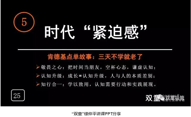 時代“緊迫感”:“雙童”樓仲平在時隔幾天去肯德基時,發(fā)現(xiàn)肯德基已經(jīng)在自助點單了,而自己還在傻傻的等工作人員點餐!這也告訴我們要不斷地學(xué)習(xí),三天不學(xué)你就老了!舊觀念終結(jié),發(fā)展模式層出不窮,新的生活方式不斷呈現(xiàn),行業(yè)變化之快,超出想象,如果你不學(xué)習(xí)就要被淘汰,你就“老了”!