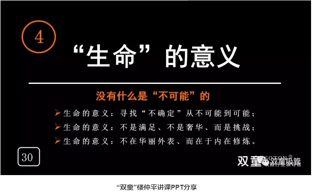 “生命”的意義:“雙童”樓仲平通過自己的經(jīng)歷告訴大家沒有什么是不可能的:沒人設(shè)計節(jié)能降耗,就自己學(xué)設(shè)計,在樊登讀書會金華分會周年慶促銷活動時,樓仲平用六個小時爭取到58個會員。我們要選擇自己想要的方式選擇自己的人生,千萬不要抱怨,抱怨是最大的瓶頸!生命的意義在于尋找“不確定”,從不可能到可能,在于不斷地挑戰(zhàn)和內(nèi)在修煉!