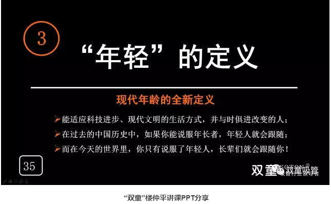 “年輕”的定義:能適應(yīng)現(xiàn)代全新的生活方式,并與時俱進的人就是年輕人!在過去的中國歷史中,如果你能說服年長者,年輕人就會跟隨;而在今天的世界里,你只有說服了年輕人,長輩們就會跟隨你!
