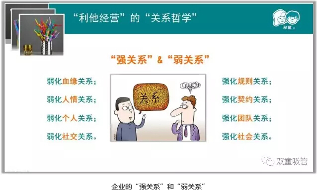 作為企業(yè),我們應(yīng)該如何去重構(gòu)“關(guān)系”?可能有許多人會(huì)馬上想到萬科王石的“弱關(guān)系”理論,但是我認(rèn)為王石只說對(duì)了一半。因?yàn)樵谥袊?guó)這樣的大環(huán)境下,企業(yè)不可能不用關(guān)系來取得成長(zhǎng)。但是作為企業(yè)管理者和經(jīng)營(yíng)者,我們應(yīng)該要學(xué)會(huì)如何引導(dǎo)企業(yè)來分清“強(qiáng)關(guān)系”和“弱關(guān)系”。下面我就重點(diǎn)來闡述“雙童”的“關(guān)系哲學(xué)”理論!