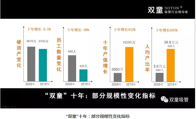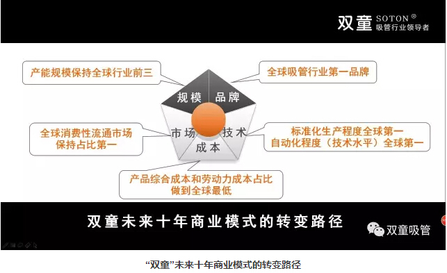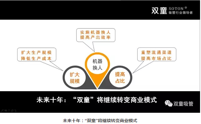 所以,未來十年,雙童將繼續(xù)轉(zhuǎn)變商業(yè)模式,在規(guī)模上保持適量擴(kuò)張,實(shí)施機(jī)器換人提高產(chǎn)出效率,重塑流通渠道,提高市場(chǎng)占比。