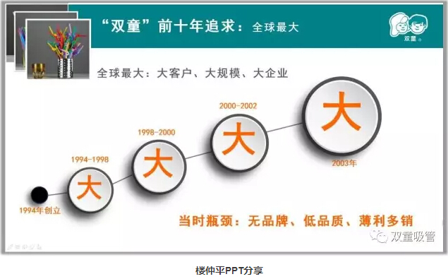 “雙童樓仲平也坦言:雙童在初期的發(fā)展和義烏許多民營企業(yè)一樣,前十年也追求全球最大,但是當時產(chǎn)生的瓶頸是無品牌、低品質(zhì)、薄利多銷。但2003年之后,雙童基于當時企業(yè)界盲目的國際化浪潮,雙童選擇了國內(nèi)與國外市場并舉,明確將市場開拓的中心轉(zhuǎn)移到國內(nèi)市場,明確開始在國內(nèi)市場投放廣告推廣,逐漸向品牌化、個性化、精細化轉(zhuǎn)變。
