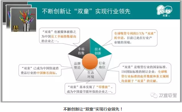 “雙童的這些改變實際上是商業(yè)模式的創(chuàng)新,基于商業(yè)價值和產(chǎn)業(yè)鏈進行創(chuàng)新。除了商業(yè)模式的創(chuàng)新之外,另一方面,雙童的創(chuàng)新都來源于基層和實踐,員工們每天都在想吸管除了喝飲料還能干什么,結合基層和實踐來獲得靈感。目前,我們發(fā)明了愛心吸管、卡通吸管、風車吸管、音樂吸管、眼鏡吸管等創(chuàng)新吸管,擁有了100多項專利,掌握了全球吸管行業(yè)近2/3的專利,并且主導著全球吸管行業(yè)的行業(yè)標準制定。
