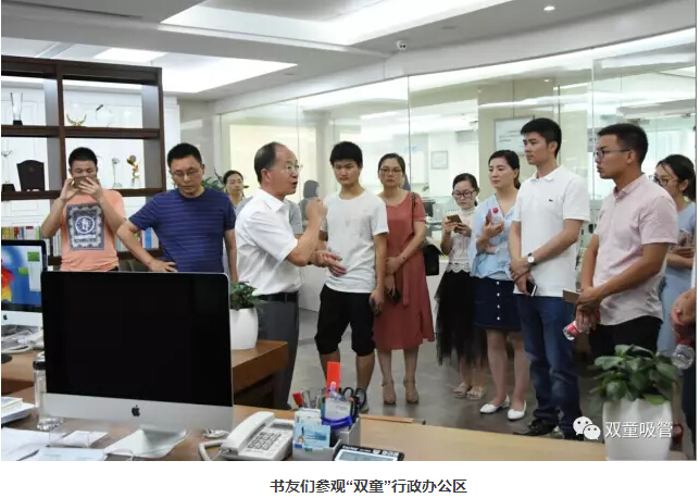 78日下午,樊登讀書會金華分會王旭飛會長以及六十多位書友們來到雙童參觀交流,這也是樊登讀書會金華分會首次企業(yè)游學(xué)活動。其實,雙童樓仲平也是樊登讀書會的書友之一,經(jīng)常受邀前往樊登讀書會的線下活動分享會,不僅獲得了一致好評,還成為了眾所周知的讀書會樓學(xué)長!