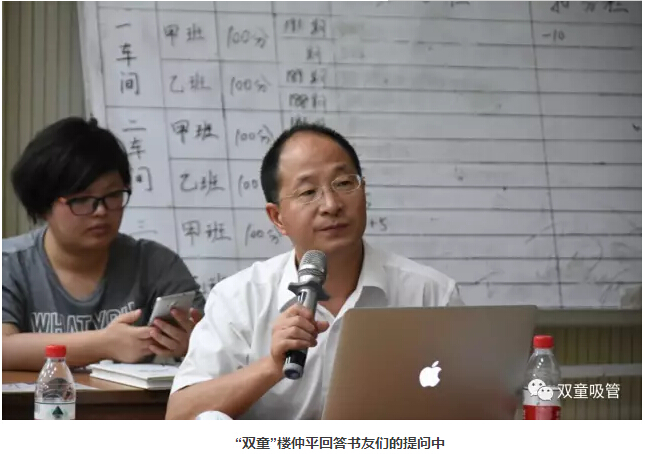 參觀結(jié)束后,大家來到了九樓閣,與“雙童”樓仲平進(jìn)行兩個多小時的深入交流。樓仲平和大家分享了自己的創(chuàng)業(yè)史以及企業(yè)經(jīng)營管理心得。實地游訪“雙童”后,書友們也有不少問題和樓總互動。接下來,吸管妞就向大家分享現(xiàn)場的精彩問答語錄吧!