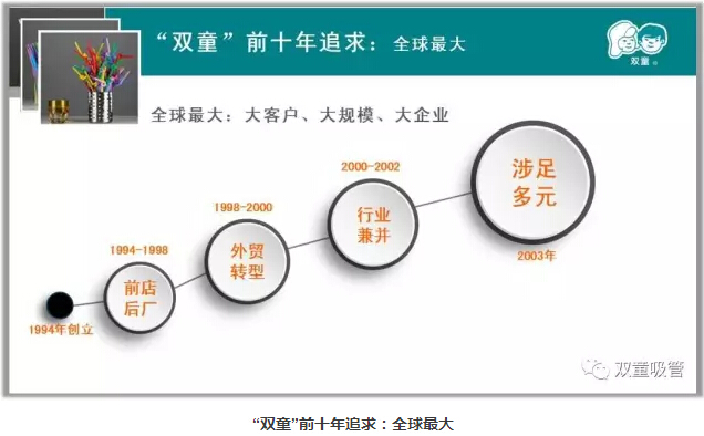 “‘雙童在前十年也不斷追求,追求大客戶、大規(guī)模、大企業(yè)。在整個(gè)過(guò)程當(dāng)中,不僅產(chǎn)品的品質(zhì)越來(lái)越低,利潤(rùn)也越來(lái)越低。2005年,雙童經(jīng)歷了痛苦的轉(zhuǎn)型,決定放棄繼續(xù)擴(kuò)張,在原有的規(guī)模下改變商業(yè)模式,寧可盈利不做大,不要做大不盈利,從全球最大成長(zhǎng)為全球最強(qiáng)。