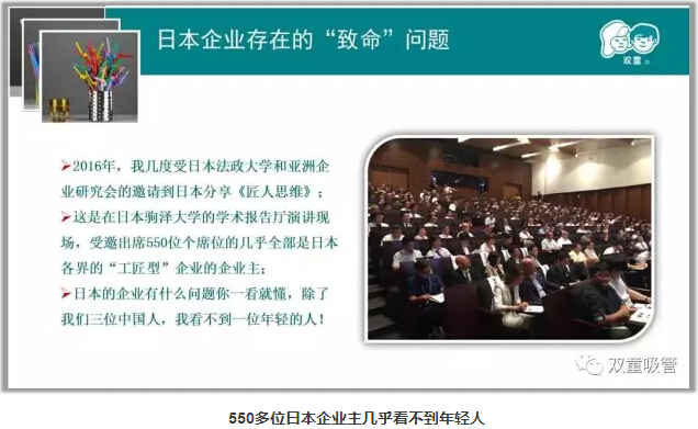 “工匠精神其實(shí)是一把雙刃劍,樓仲平通過(guò)日本企業(yè)的案例闡述了這一觀點(diǎn):去年開(kāi)始,我?guī)锥仁苋毡痉ㄕ髮W(xué)和亞洲企業(yè)研究會(huì)的邀請(qǐng)到日本分享《匠人思維》,在分享過(guò)程中,我發(fā)現(xiàn)一個(gè)很明顯的問(wèn)題,基本上來(lái)聽(tīng)課學(xué)習(xí)的幾乎是60歲以上的日本企業(yè)主,幾乎看不見(jiàn)年輕人。究其原因,是由于極致的工匠精神讓日本的年輕人不愿意接班。同時(shí),隨著日本企業(yè)主平均年齡越來(lái)越大,普遍缺乏時(shí)代變革下的創(chuàng)新思維,導(dǎo)致日本大量工匠企業(yè)被時(shí)代拋棄。所以,我們要慎防成也工匠精神,敗也工匠精神!