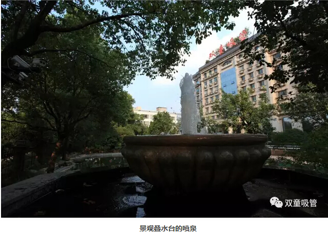 經(jīng)過九曲橋,來到湖邊的景觀疊水臺,一道噴泉沖天而起,散開漫天花雨,沖入水池里的水不停地翻滾著,倒影迷幻,美麗極了!