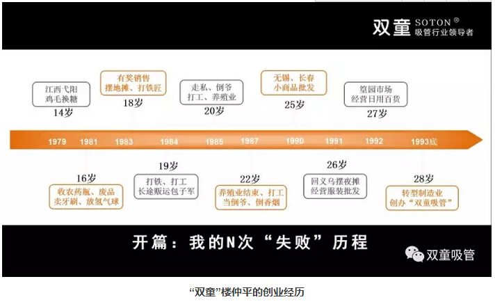 “雙童樓仲平一開始出生在極端貧困中,初中輟學,身為熱播電視劇《雞毛飛上天》男主角陳江河的原型人物之一,樓仲平從14歲跟隨父親去江西雞毛換糖,在雞毛換糖的過程當中勇于創(chuàng)新,持續(xù)折騰。在1979-1994年期間做了二十多個行當,打工、創(chuàng)業(yè),還養(yǎng)過魚,經過多次失敗后終于在吸管這個行業(yè)上扎根。