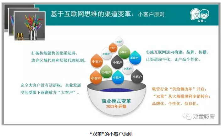 2003年以后,樓仲平受日本友人的影響開始反思原有的商業(yè)模式,實施了小客戶原則,放棄了眾多跨國大買家,更側重于酒吧、夜總會、KTV、咖啡廳等中高端消費的小訂單?,F(xiàn)在,雙童的小客戶達到了12000多家,通過訂單的積累,長期為企業(yè)創(chuàng)造價值。
