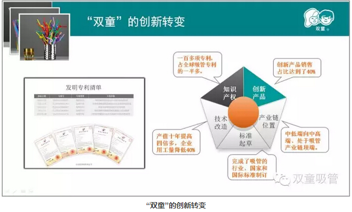 這些年來,樓仲平也一直致力于推動雙童的創(chuàng)新工作,并研發(fā)了愛心吸管、風車吸管、哈哈吸管、音樂吸管等100多種創(chuàng)新產品。目前為止,擁有了100多項專利,掌握了全球吸管行業(yè)近2/3的專利!通過標準、知識產權、科技的創(chuàng)新,雙童也逐步從全球最大成長為全球最強!