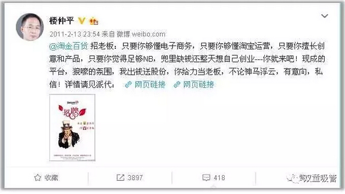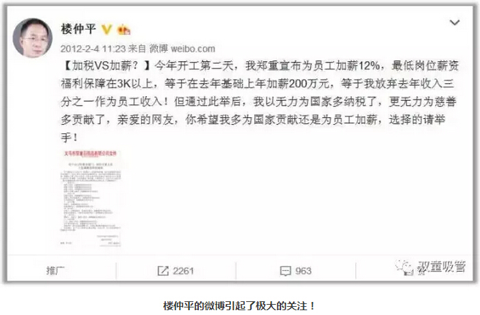通過對經營模式的創(chuàng)新改變,雙童創(chuàng)造了差異化亮點,引發(fā)了大批媒體的關注和報道。這讓雙童樓仲平體會到了社會關注對雙童品牌的助推作用,也引發(fā)了如何不花一分錢去引導媒體關注的思考。2009年,新浪微博應運而生,深受互聯(lián)網影響的雙童樓仲平成為了首批受邀開通的博主,并注冊了個人微博和雙童企業(yè)微博。在寫微博期間,由于當時他寫的微博更多是企業(yè)管理認知和中小企業(yè)思考的話題,所以寫這些博文時需要查閱大量的資料和信息,這也促進了樓仲平更快的提升。同時,他寫的微博也得到了社會各界的極大關注,乃至于一年多時間寫到了當時金華地區(qū)微博流量最大的民營企業(yè)主之一。