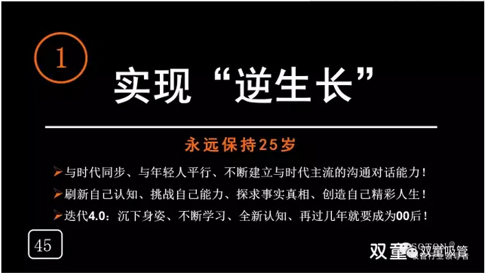 未來已來,雙童樓仲平在面對這個瞬息萬變的現(xiàn)代信息社會時,充滿了緊迫感和進取心,他意識到唯有持續(xù)學習、不斷改變才能緊跟時代發(fā)展,唯有嘗試新的突破,轉變自己的思維,永遠將自己定位在25歲,才能完成下一次向00后的迭代,從而影響團隊并保證雙童不被時代所淘汰!