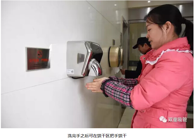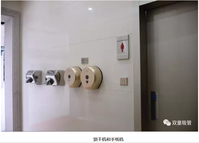 “雙童每個(gè)洗手間的格局分明,除了男女衛(wèi)生間外,還設(shè)置了洗手區(qū)、烘干區(qū)、手紙區(qū),配置十分齊全。進(jìn)入衛(wèi)生間前,員工可以在手紙區(qū)取紙巾。洗手后,還可以用烘干機(jī)把手烘干。