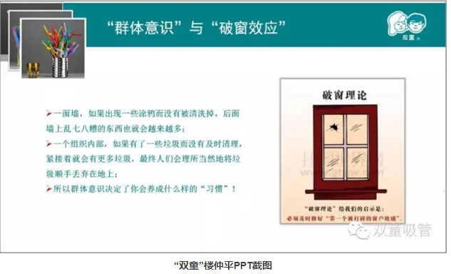 個(gè)體習(xí)慣依附于“群體意識(shí)”,環(huán)境會(huì)潛移默化地影響員工的素養(yǎng),環(huán)境不好則會(huì)產(chǎn)生破窗效應(yīng)。比如一個(gè)素養(yǎng)再差的農(nóng)民工,到了“雙童”這樣好的企業(yè)環(huán)境中工作和生活,習(xí)慣也會(huì)慢慢變好,整體素養(yǎng)也會(huì)得到有效提升。