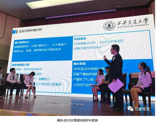 在經(jīng)過一個(gè)小時(shí)的盲審之后,晚上7點(diǎn),總決賽現(xiàn)場答辯環(huán)節(jié)正式開始!現(xiàn)場所有評(píng)委及五六百位各大院校的師生,四支隊(duì)伍圍繞著“雙童”的《以小博大,一根吸管的藍(lán)海之旅》作為PK的案例。其中,進(jìn)入決賽的四支隊(duì)伍每兩支隊(duì)伍作為一個(gè)答問環(huán)節(jié),舞臺(tái)上分為左右兩排,派出4位同學(xué)進(jìn)行答辯。每個(gè)隊(duì)伍通過12分鐘對(duì)“雙童”的案例進(jìn)行陳述、分析、評(píng)價(jià),提出新的商業(yè)模式。值得一提的是,在互動(dòng)環(huán)節(jié)中,評(píng)委們不斷提及“雙童”樓仲平也在現(xiàn)場,這也為比賽帶來了更多的緊張感和挑戰(zhàn)性!