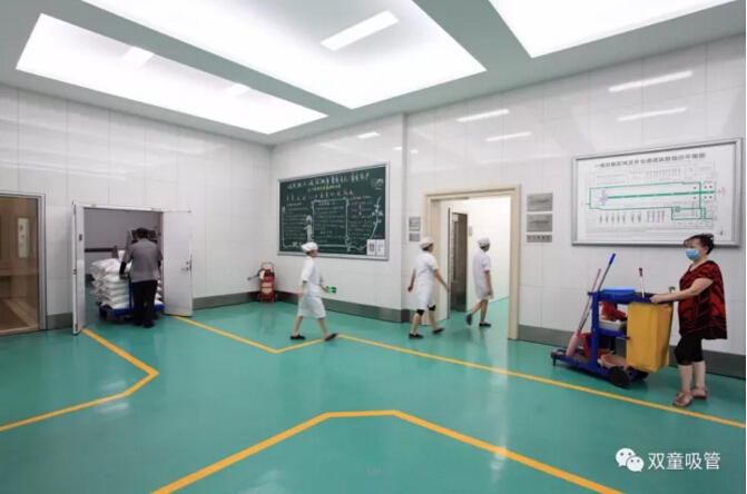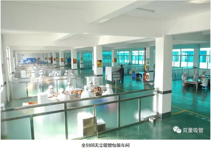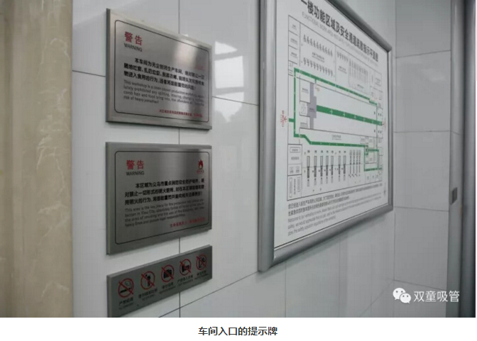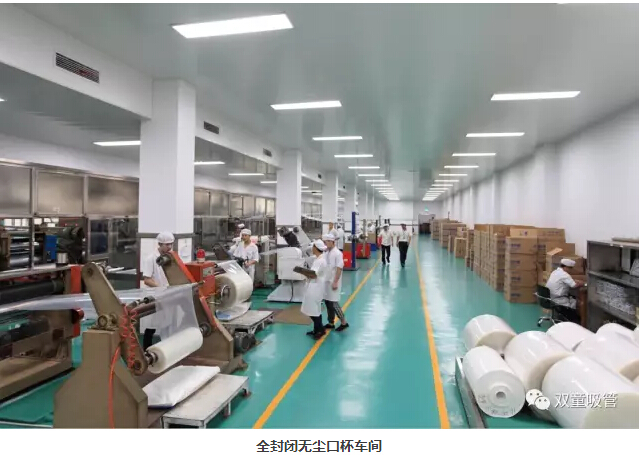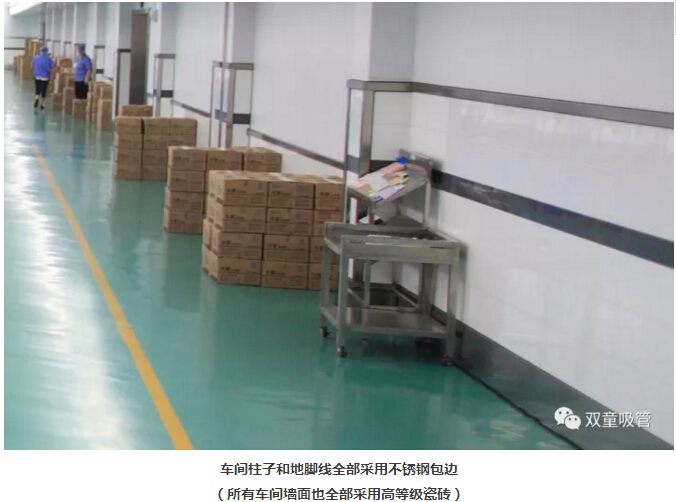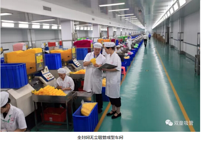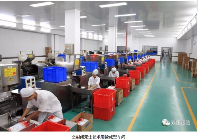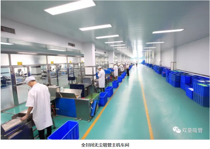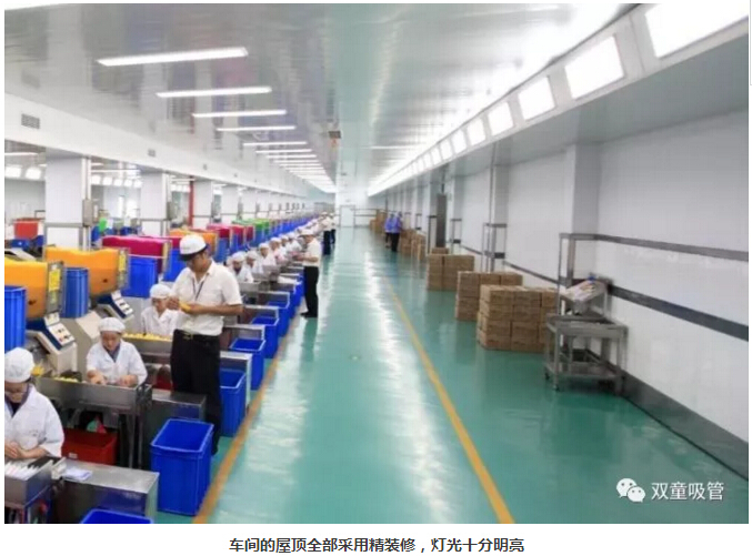 “雙童車間的每個入口,有著許多安全、衛(wèi)生提示的標(biāo)牌,引導(dǎo)員工門在進(jìn)入車間時要注意安全和衛(wèi)生防護(hù)工作。進(jìn)入車間內(nèi)部,一列列整齊的機(jī)器、一箱箱五顏六色的吸管、一條條清晰分明的分界線,車間內(nèi)全部安裝了恒溫空調(diào),屋頂全部進(jìn)行精裝修寬敞明亮,柱子和地腳線用不銹鋼進(jìn)行包邊,大大增加了建筑年限。所有員工皆穿著潔白的工作服,正在忙碌地進(jìn)行生產(chǎn)工作。