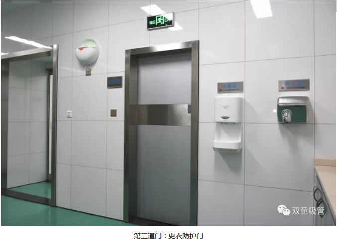 3.經(jīng)過了兩道防護(hù)門后,員工們更衣后通過更衣防護(hù)門進(jìn)入洗手消毒區(qū)域。
