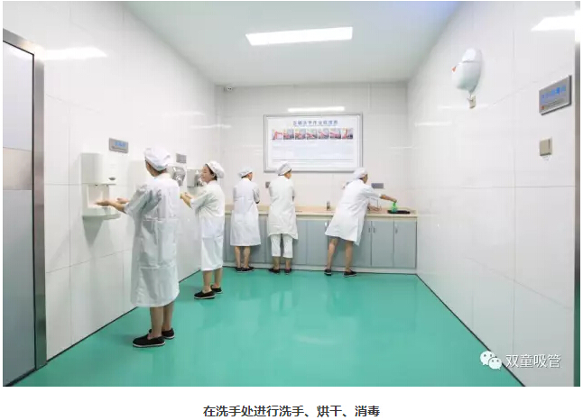 4、整理完衣物后,來到洗手消毒間,進(jìn)行洗手、烘干、消毒。
