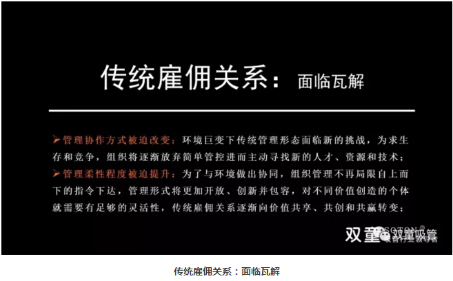 在新時代背景下,管理進入了信息管理時代,組織管理逐漸扁平化,員工管理逐漸互聯(lián)化,員工與組織形成共生關(guān)系。通過這樣的轉(zhuǎn)變,傳統(tǒng)雇傭關(guān)系面臨瓦解,管理協(xié)作方式被迫改變,組織將逐漸放棄簡單管控進而主動尋找新的人才、資源和技術(shù)。管理形式也將更加開放、創(chuàng)新并包容,對不同價值創(chuàng)造的個體就需要有足夠的靈活性,傳統(tǒng)雇傭關(guān)系逐漸向價值共享、共創(chuàng)和共贏轉(zhuǎn)變!