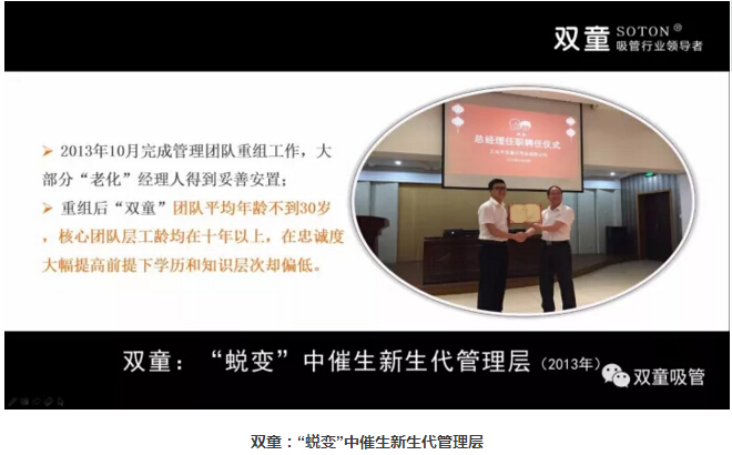 面對這樣的現(xiàn)狀,“雙童”選擇了主動“蛻變”,在2011年發(fā)布了第三個《企業(yè)五年發(fā)展規(guī)劃》,明 確“再造經(jīng)理人”計劃,明確領(lǐng)導(dǎo)層更替:選拔培養(yǎng)年輕領(lǐng)導(dǎo)層、重要崗位領(lǐng)導(dǎo)年輕化、明確實施股份制改革,慢慢解決管理層老化問題!重組后的“雙童”團隊平均年齡不到三十歲,大部分核心團隊的工齡在十年以上,學(xué)歷、知識層次和忠誠度大幅提高!