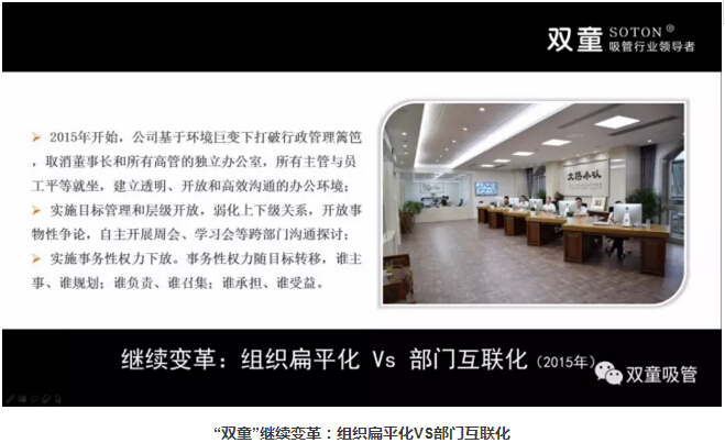 基于時代的改變和挑戰(zhàn),“雙童”在2015年對組織形式做出新的變革,打破行政管理籬笆,通過平等、透明、開放的辦公環(huán)境,消除部門之間的隔閡,實施目標(biāo)管理和層級開放,弱化上下級關(guān)系,自主開展周會等跨部門溝通探討,提升部門工作效率。同時,實施事務(wù)性權(quán)力下放,大家以解決事務(wù)為核心,讓權(quán)力隨事務(wù)轉(zhuǎn)移,誰主事、誰規(guī)劃;誰負(fù)責(zé)、誰召集;誰承擔(dān)、誰受益,一切以工作結(jié)果為導(dǎo)向,也實現(xiàn)了跨部門互通互聯(lián)、共同探討!