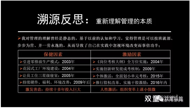 “雙童”經(jīng)歷團隊“蛻變”后,通過學(xué)習(xí)會意識引導(dǎo)、推動家文化人性管理以及全方位改善員工的生活生產(chǎn)環(huán)境,提升團隊認(rèn)知意識和凝聚力!經(jīng)歷“蛻變” 后團隊凝聚力確實有所提升,但客觀上基層員工的流動性依然較大,對高端人才引進還是沒有太大吸引力,企業(yè)的持續(xù)發(fā)展明顯存在著天花板瓶頸。