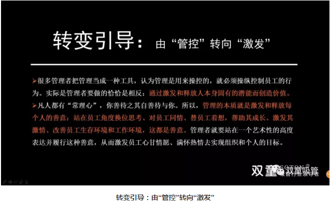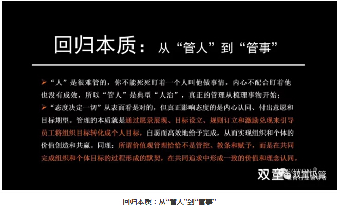 管理的本質(zhì)是“管事”而非“管人”,通過愿景展現(xiàn)、目標(biāo)設(shè)立、規(guī)則訂立和激勵兌現(xiàn)來引導(dǎo)員工將組織目標(biāo)轉(zhuǎn)化成個人目標(biāo),自愿而高效地給予完成,從而實現(xiàn)組織和個體的價值創(chuàng)造和共贏。同時,通過培訓(xùn)、授權(quán)和激勵,激發(fā)和釋放人本身固有的潛能而創(chuàng)造價值。所以,管理的本質(zhì)管理不是管控、教條和賦予,而是在共同完成組織和個體目標(biāo)的過程形成的默契,在共同追求中形成一致的價值和理念認(rèn)同。