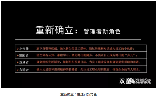 小伙伴:管理者和員工一起平等工作,不要高高在上,放下身姿和權(quán)威,融入新生代員工群體,通過溝通和對話成為員工的小伙伴;