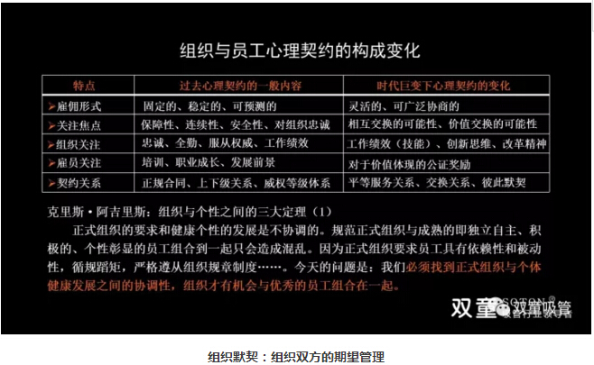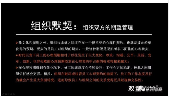 組織默契,組織雙方的期望管理:除了文化和規(guī)則之外,組織與成員之間還存在一個很重要的心理性契約,也就是彼此希望獲得的預(yù)期,更多的是員工對組織的期望。